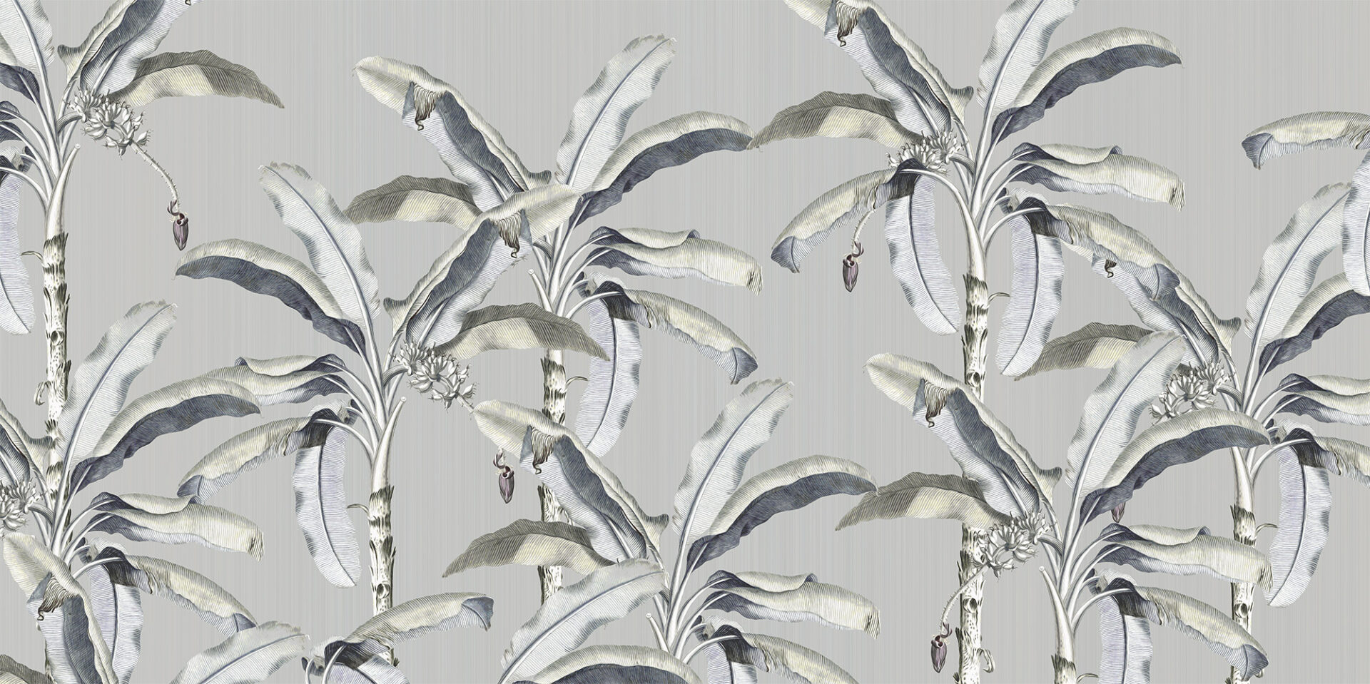 Dieses Design interpretiert tropische Vegetation in einer klaren, grafischen Formensprache. Das stilisierte Blattwerk erinnert an Palmen- und Bananenbäume, bleibt jedoch bewusst abstrahiert – ein Gestaltungselement, das Natürlichkeit und Struktur in ausgewogenem Verhältnis vereint. Durch feine Linienführung und rhythmische Komposition entsteht ein ruhiges, architektonisch wirkendes Muster, das Räumen Tiefe und Charakter verleiht, ohne dominant zu wirken.